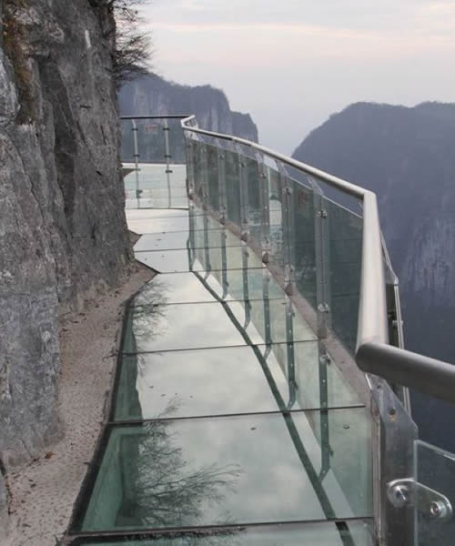 | 2011年10月1日,張家界天門山國家森林公園新建的玻璃棧道正式對游客開放。玻璃棧道懸于天門山頂西線,長60米,最高處海拔1430米。是張家界天門山景區(qū)繼懸于峭壁之上的鬼谷棧道、憑空伸出的玻璃眺望臺、從玻璃臺可以看見下面。玻璃臺伸出棧道有4-5米,專供游人拍照、橫跨峽谷的木質(zhì)吊橋后打造的又一試膽力作。為了讓游客零瑕疵的透過玻璃橋看到美麗的風景,上橋的游客均要求戴上鞋套,以保持玻璃橋的透明和干凈。玻璃棧道的刺激震撼,可與舉世聞名的美國大峽谷玻璃走廊“天空之路”媲美,因而有了東方“天空之路”的美譽。